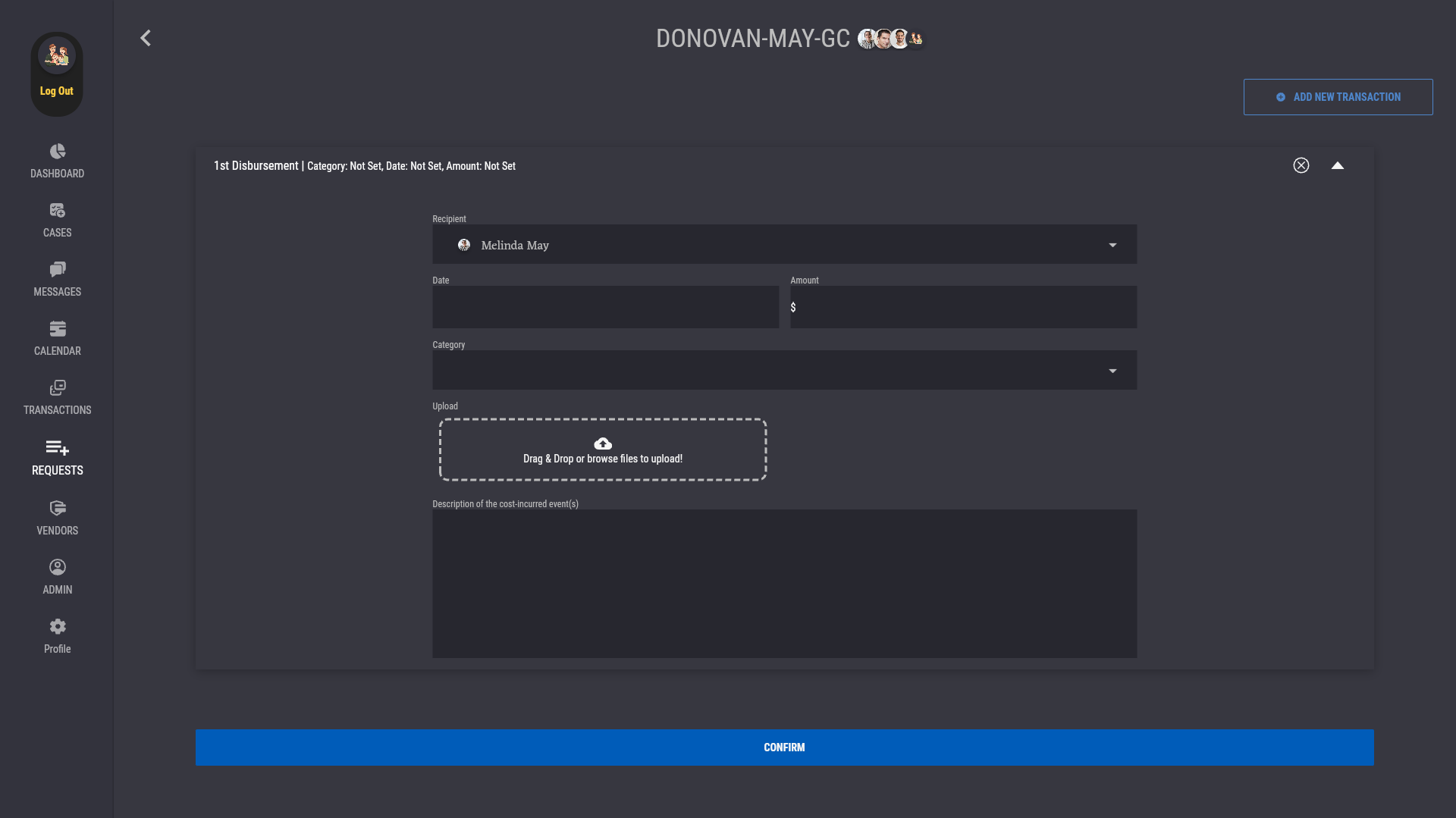 Then, press "Add New Transaction" to start filling out the information about the transaction. Then select a recipient and complete the required fields of the form. The user may also add multiple transaction requests and submit those transactions together. To cancel requesting a transaction, press the