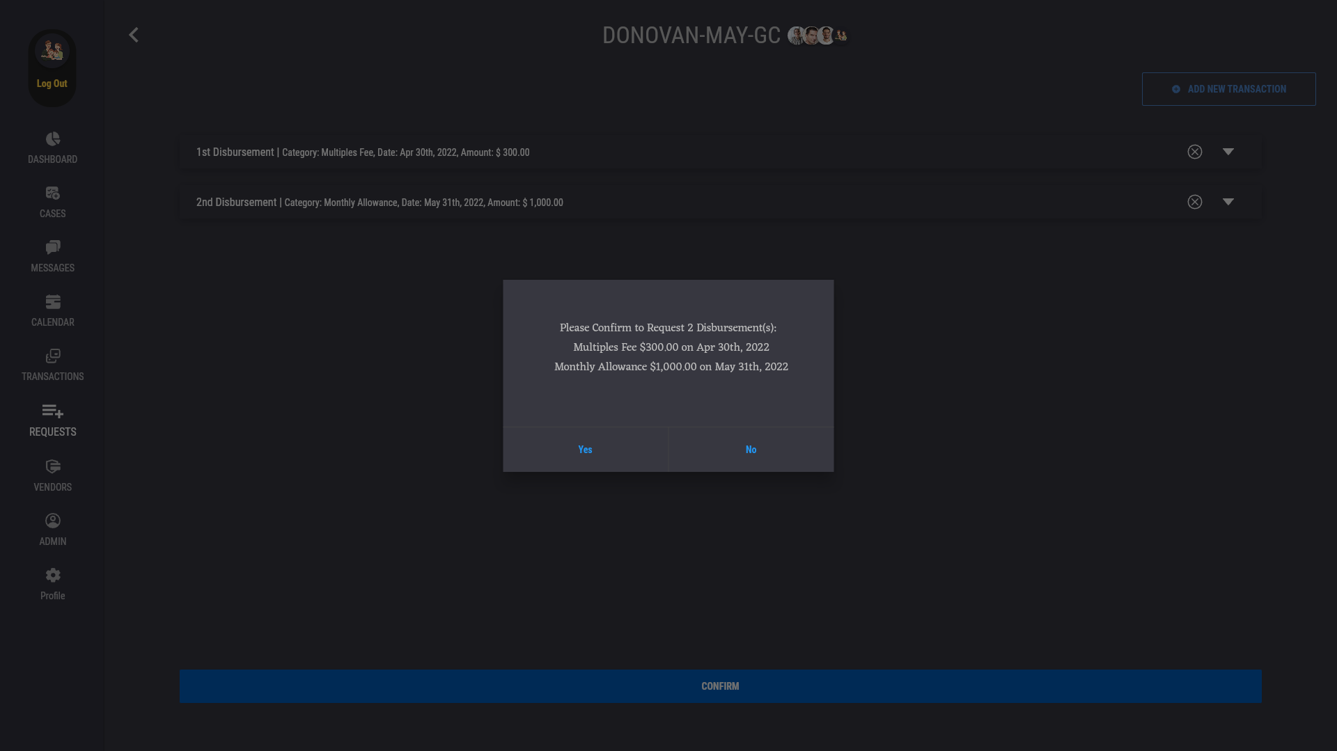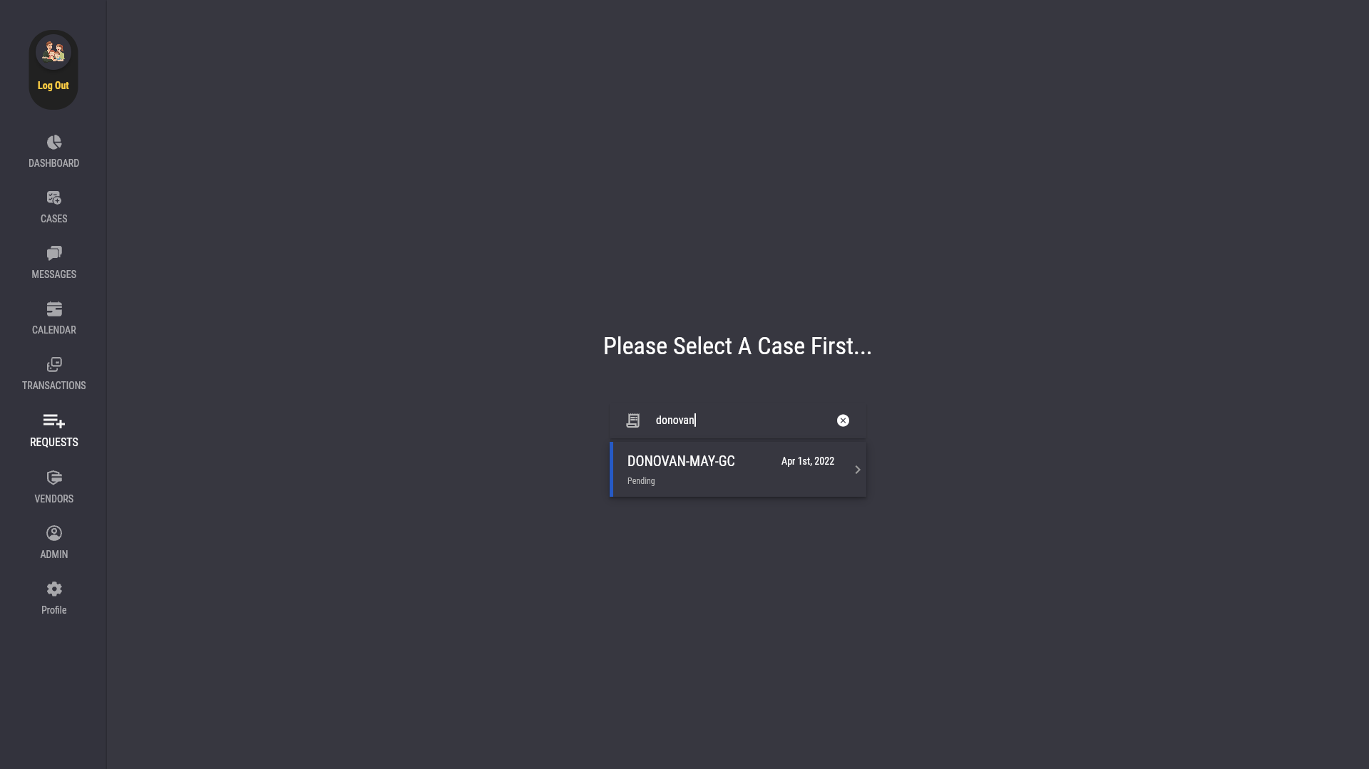 Since a transaction is case-specific, a case must be specified. If the user has multiple cases, the user will be asked to choose a case. Type in the case name or the name of a case member, and press the case you'd like to make a transaction in.