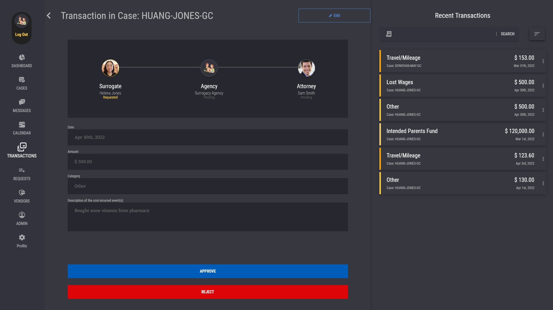 Clicking on a Transaction tile will open a new window containing the details of that transaction, called the "Transaction Detail" page. You can view the transaction's Members, Date, Amount, Category, and Description. Eligible users are able to approve or reject the transaction by pressing the "Approve" or "Reject" button, and pressing "Yes" in the subsequent confirmation dialog.