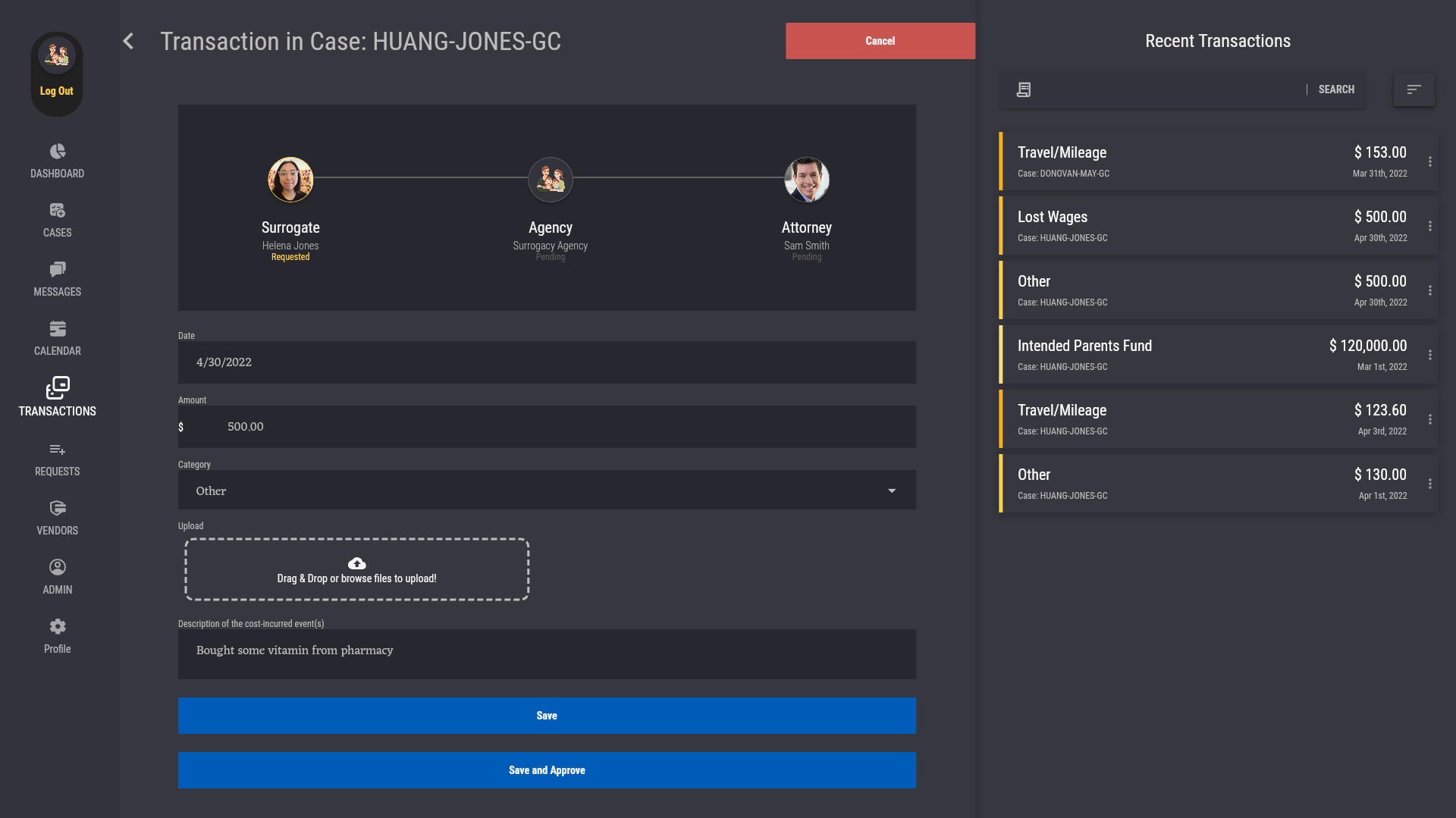 On the "Edit Transaction" page, you can update the properties of the transaction. Click the "Save" button when you're finished editing, or click the "Cancel" button to cancel your edit and go back to the "Transaction Detail" page. You can also click the "Save and Approve" button to approve the transaction with your updated information in one click.