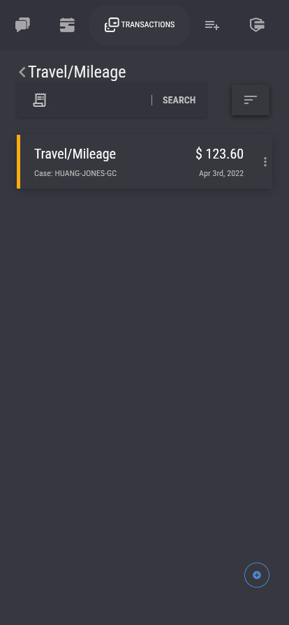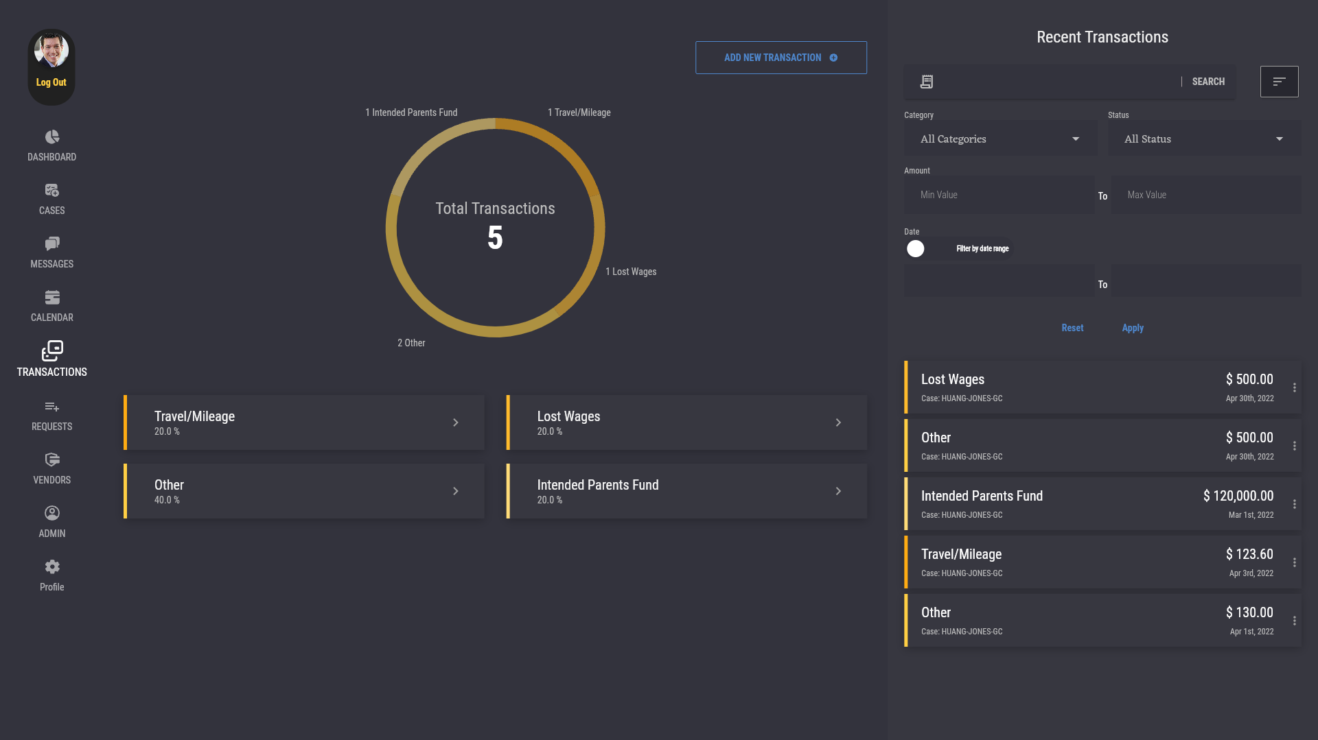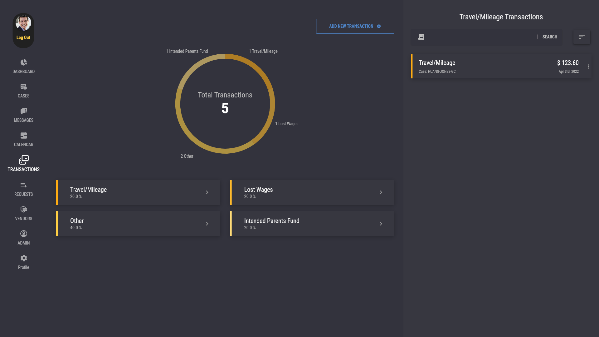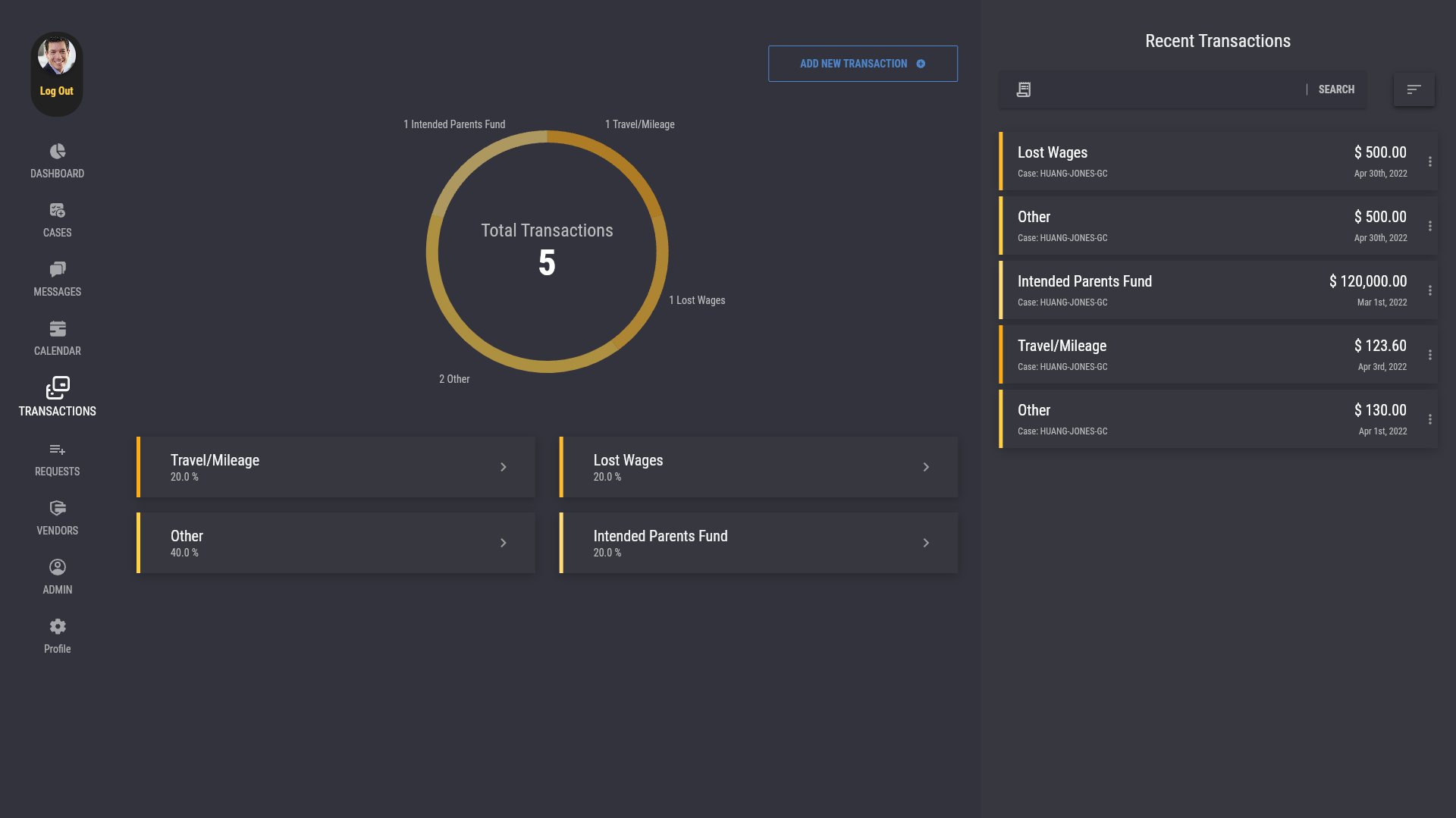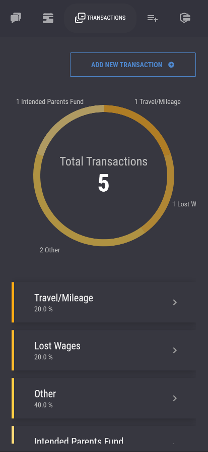 The "Transactions" tab takes the user to the "Transactions" page. The "Transactions" page consists of an "Add New Transaction" button, a pie chart of the user's transactions in the main view, categories of existing transactions, as well as a list of transactions in the secondary section. Transactions are displayed as "Transaction Tiles" in the transaction list. Each Transaction Tile contains the transaction's category, case information, amount, and date.