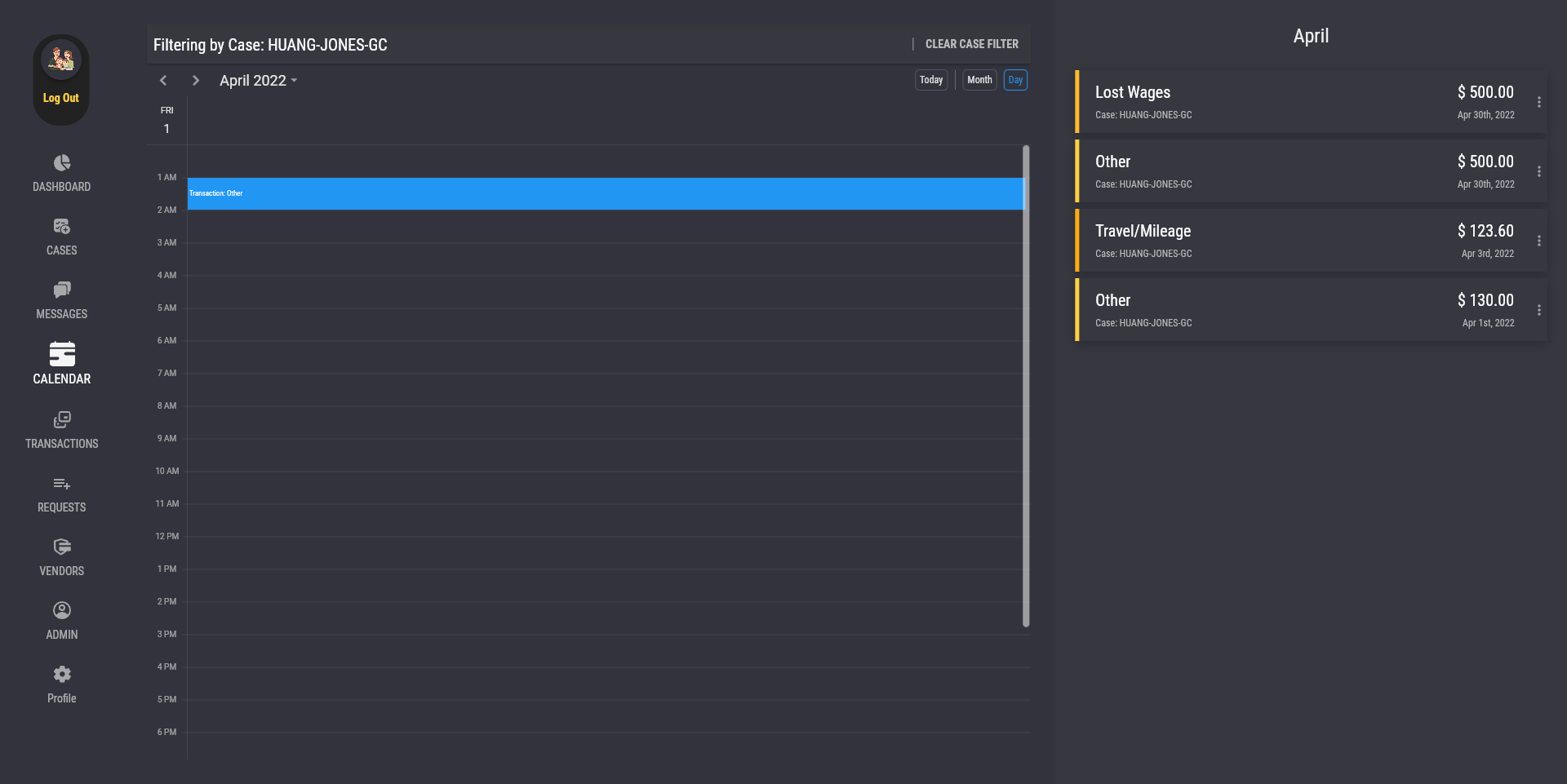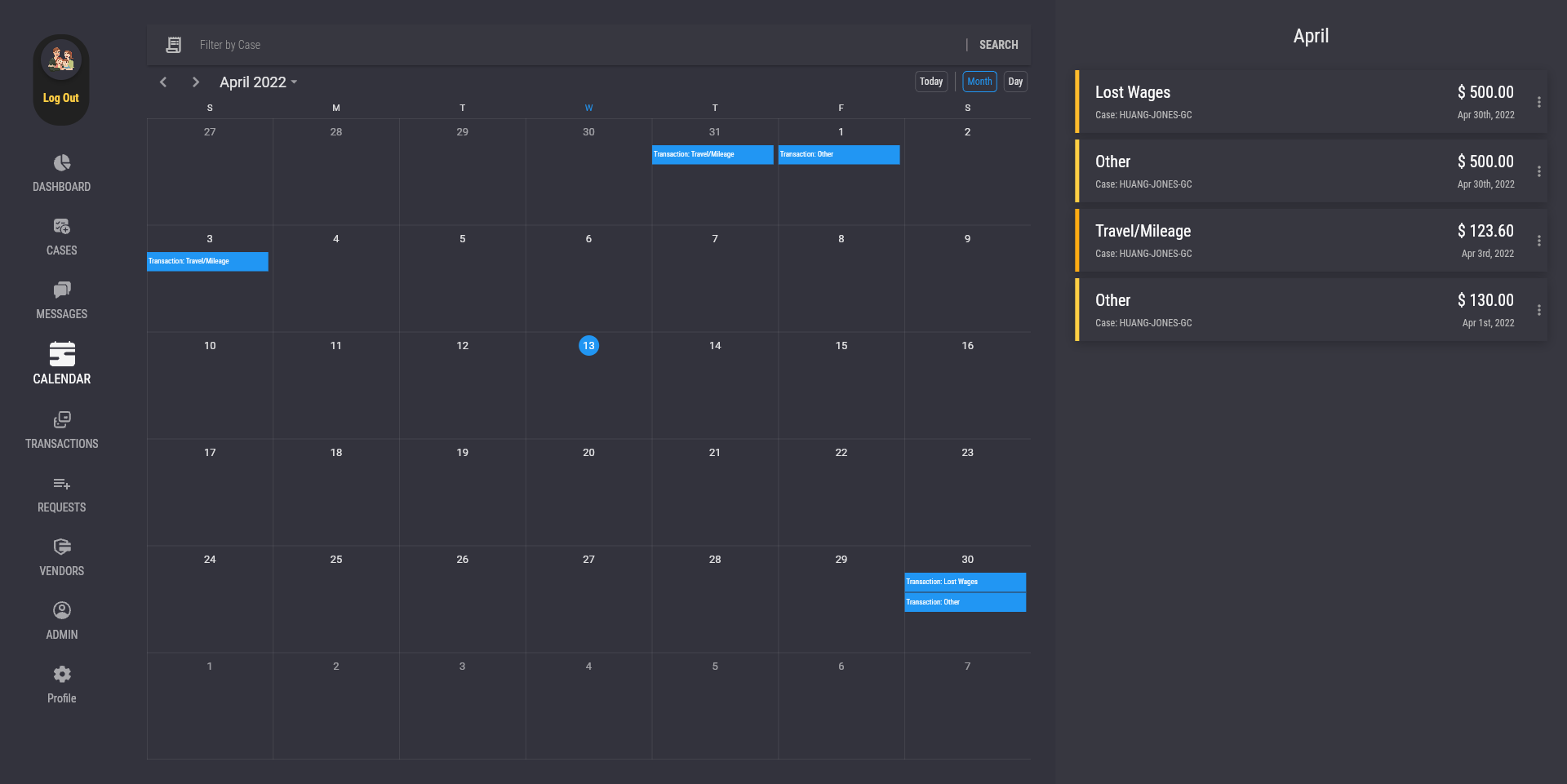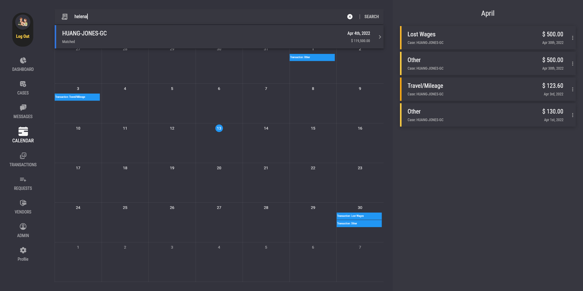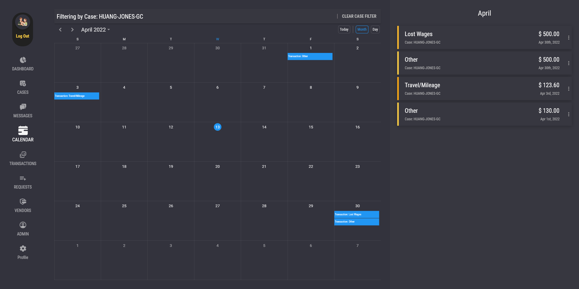 The search bar at the top of the calendar page allows the user to change the calendar to only display a specific case. To do so, click on the "Filter by Case" search bar at the top of the calendar, and type in either the name of a case or the name of a case member, then click on a case in the suggestions. Click on the "Clear Case Filter" button to remove the case filter and display transactions of all cases in the calendar.