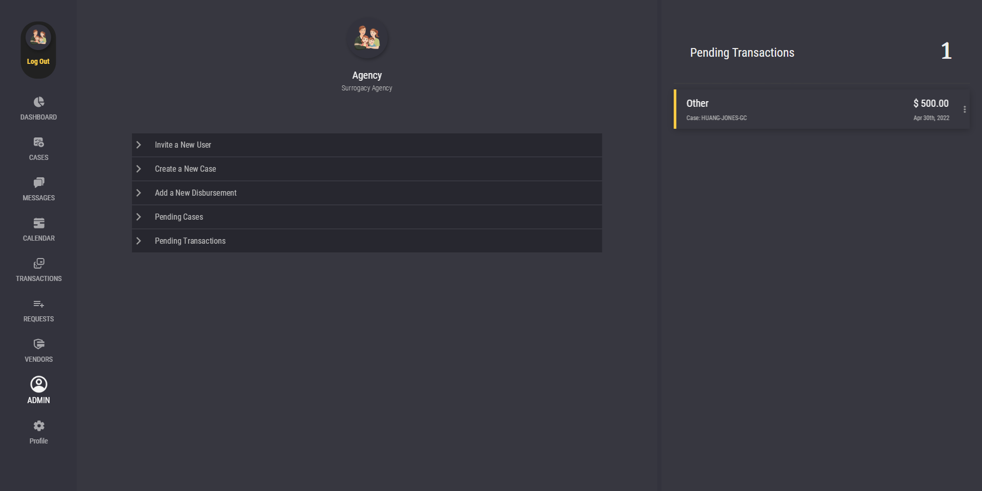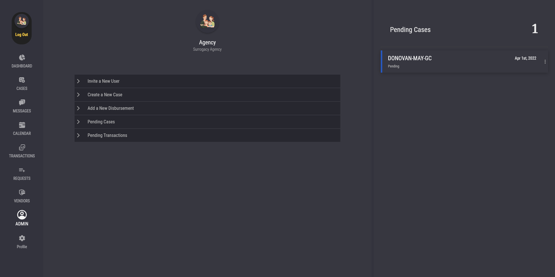 The Admin Panel allows admin users, which includes Agency, Attorney, and Independent Intended Parent users, to perform several admin-only actions. To start using the Admin Panel, go to the "Admin" tab.