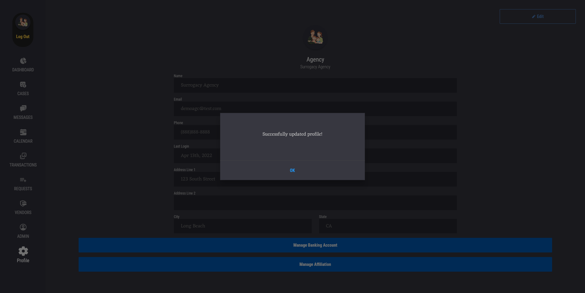To view or edit your TrustUS account profile, press the "Profile" tab to go to the Profile page. On this page, you can view your TrustUS account's profile information, such as user name, email, phone, last login, and address.
