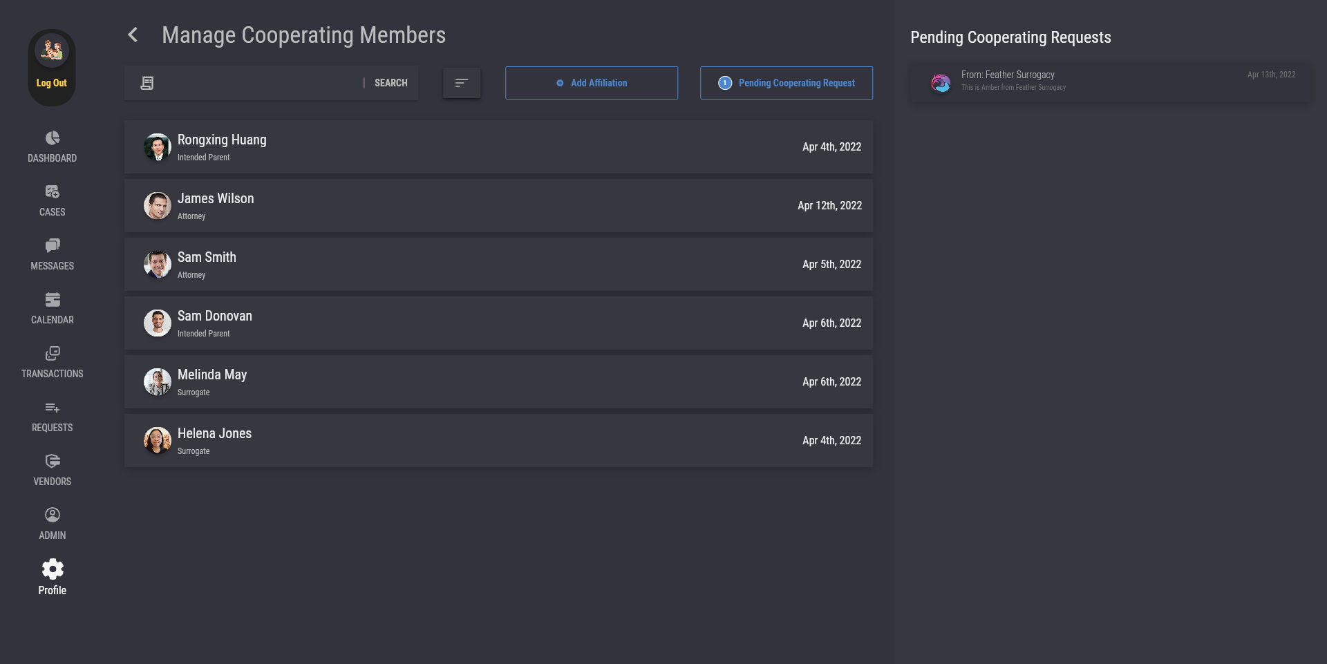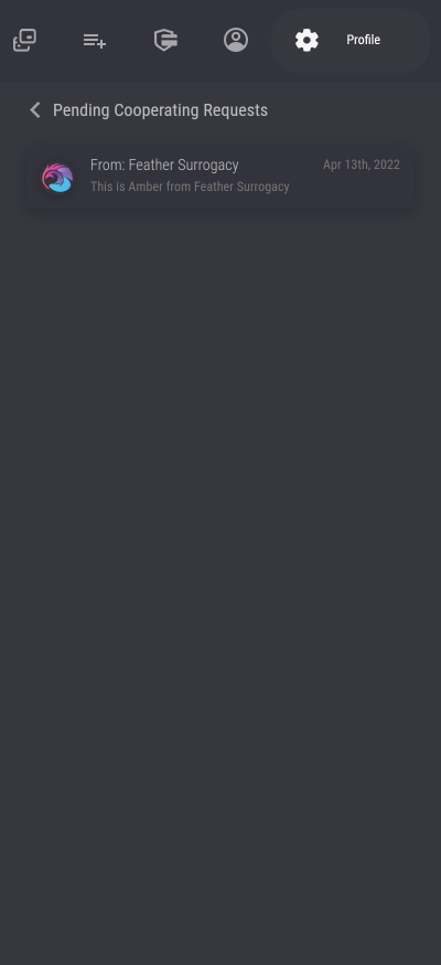 To view your pending affiliation requests, press the "Pending Cooperating Request" button. If you do not see this button, it means that you currently do not have any pending affiliation requests. In desktop mode, your pending affiliation requests will show up in the right sidebar. In mobile mode, a new page will open instead.