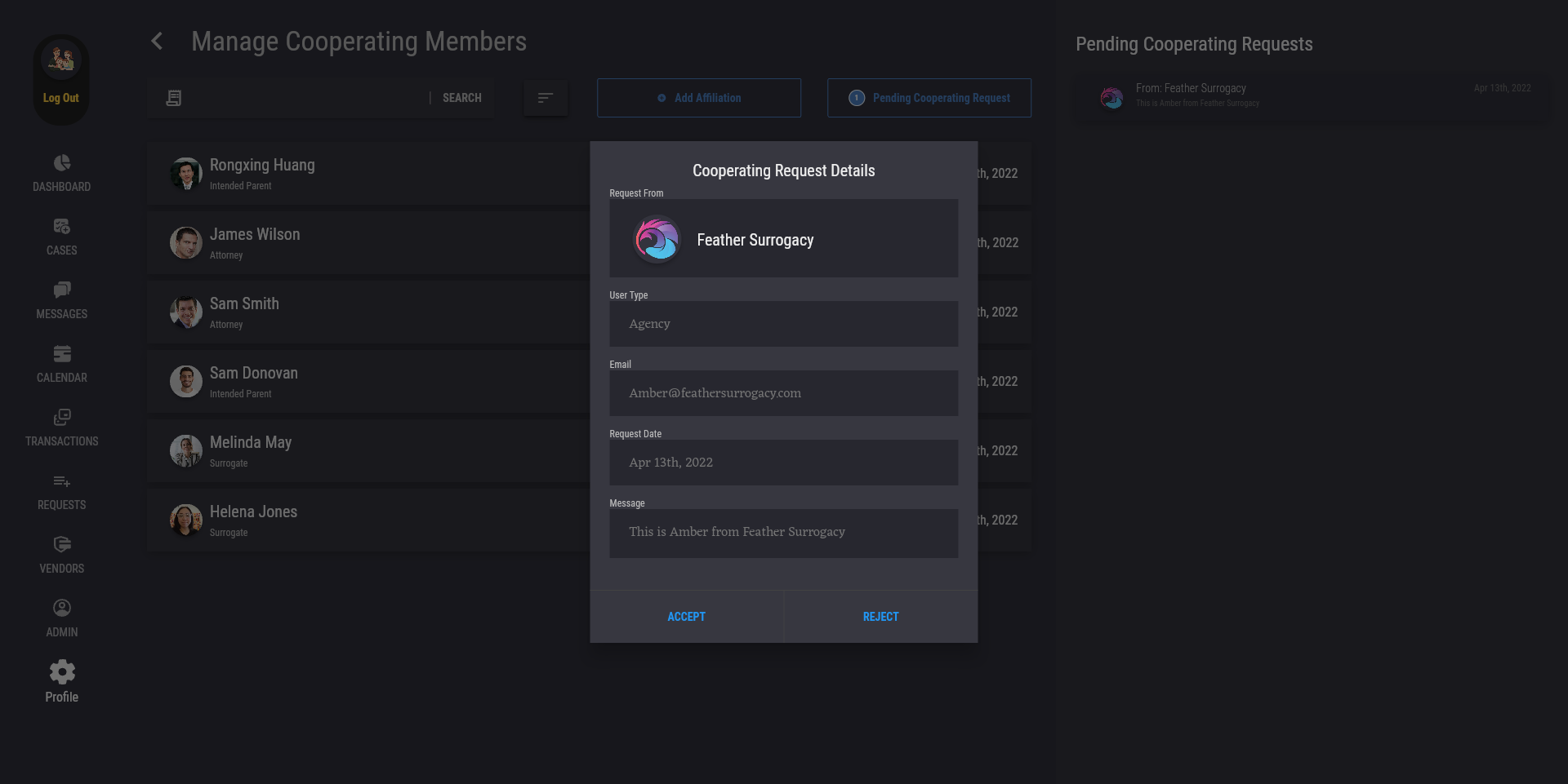 To interact with your pending affiliation requests, press a request to open the "Cooperating Request Details" dialog. After verifying the request, press "Accept" to accept the request, or press "Reject" to reject the request.