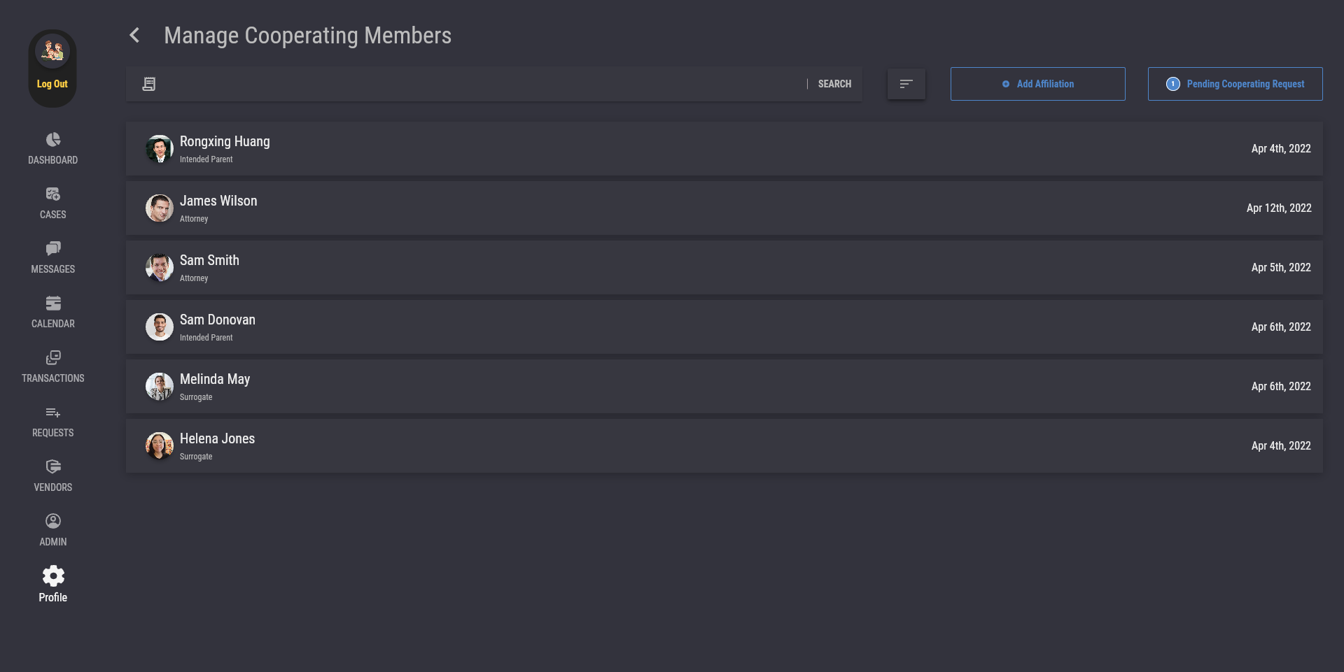 To view your affiliations, go to the "Profile" tab and press the "Manage Affiliations" button at the bottom of the page. This will take you to the "Manage Cooperating Members" page. On this page, you can view, search within your affiliations, add a new affiliation, and view pending affiliation requests.