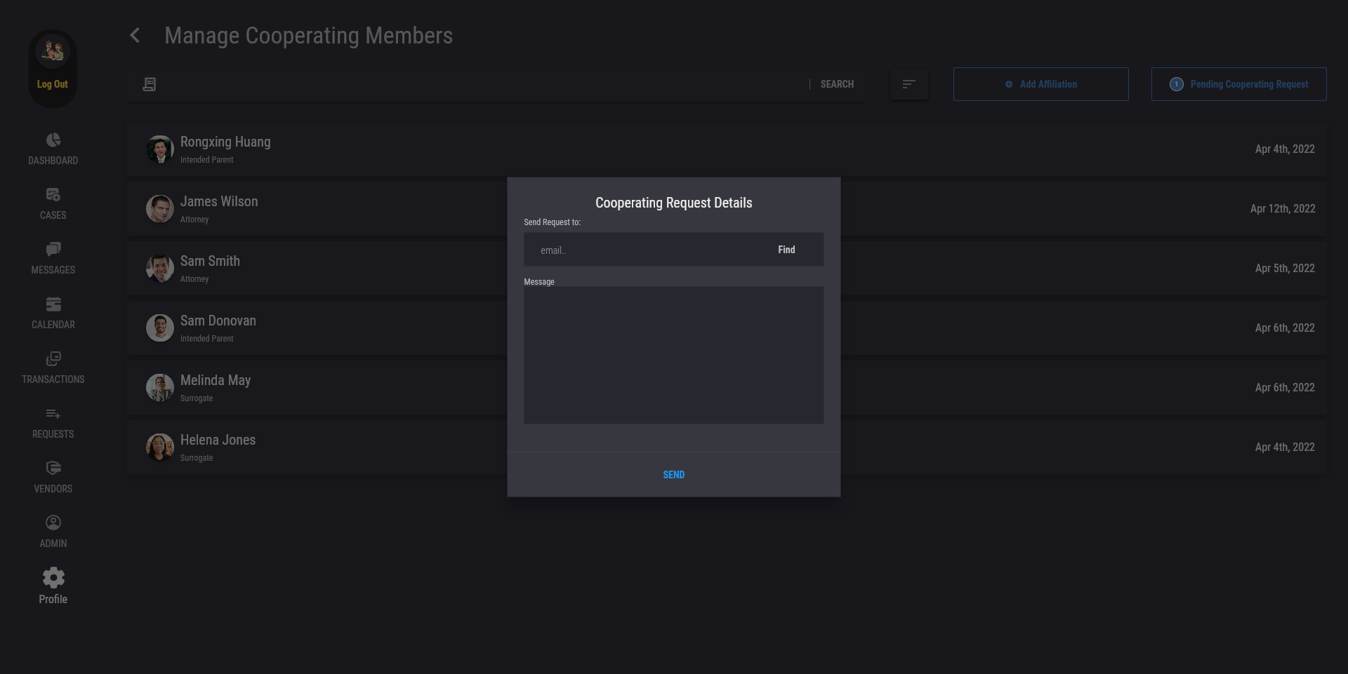 To add a new affiliation, press the "Add Affiliation" button. This will open the "Cooperating Request Details" dialog, where you can select look up a user to send an affiliation request to and attach a message. Press "Send" to send out the affiliation request.