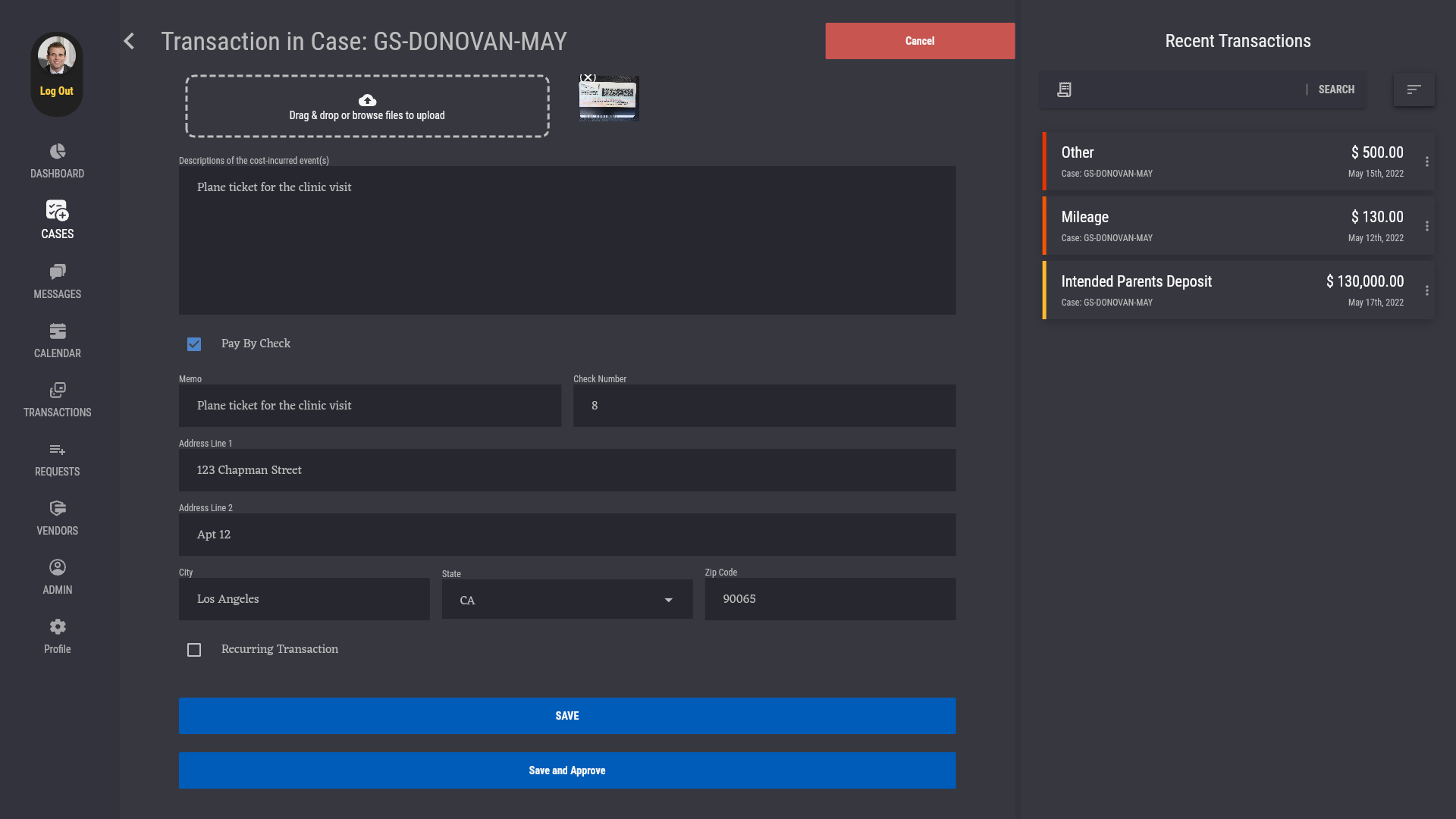 To approve a transaction that is set to "Pay by Check", go to the transaction's detail page and press "Approve"