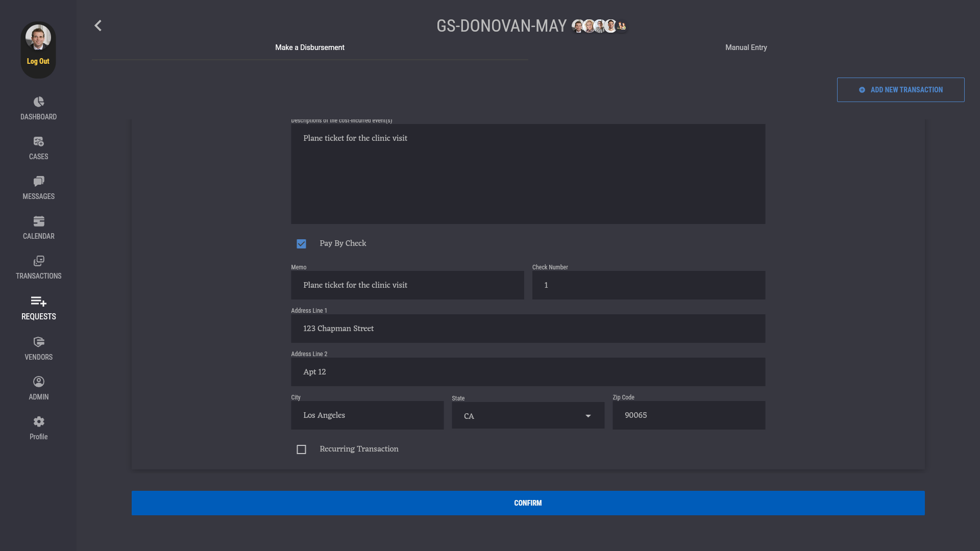 In order to make or request payment by check, create a new transaction through the "Requests" page or edit an existing transaction, and then select the "Pay by Check" checkbox.