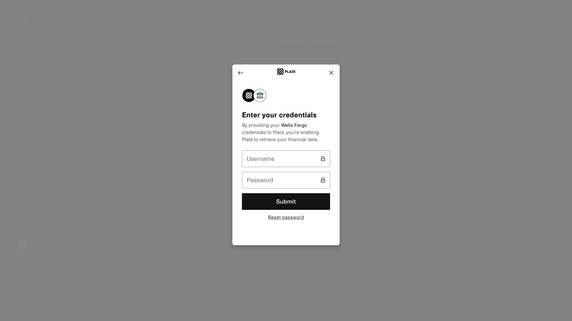 On the next page, provide your login credentials to sign in to your Plaid Account, then press "Submit".