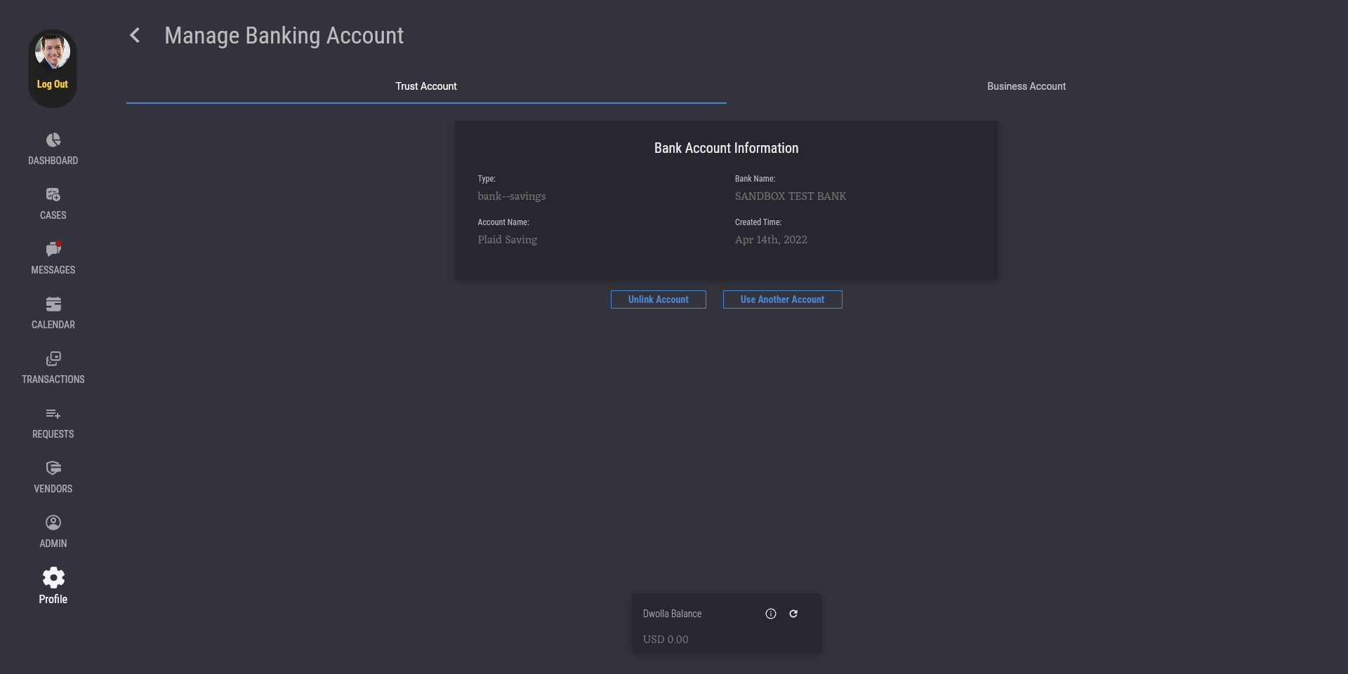 Attorney Users You can edit your linked bank accounts, as well as view your Dwolla Balance. As an attorney user, you can link 2 separate bank accounts for your Trust Account and Business Account. Press "Link on Plaid" to link a bank account to either your Trust Account or your Business Account. You are also able to unlink or change your linked bank account in the future.