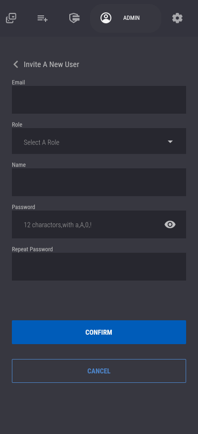 To invite a new user, you will create an account for the new user by filling out the invitation form. You must provide the following for the invited user: