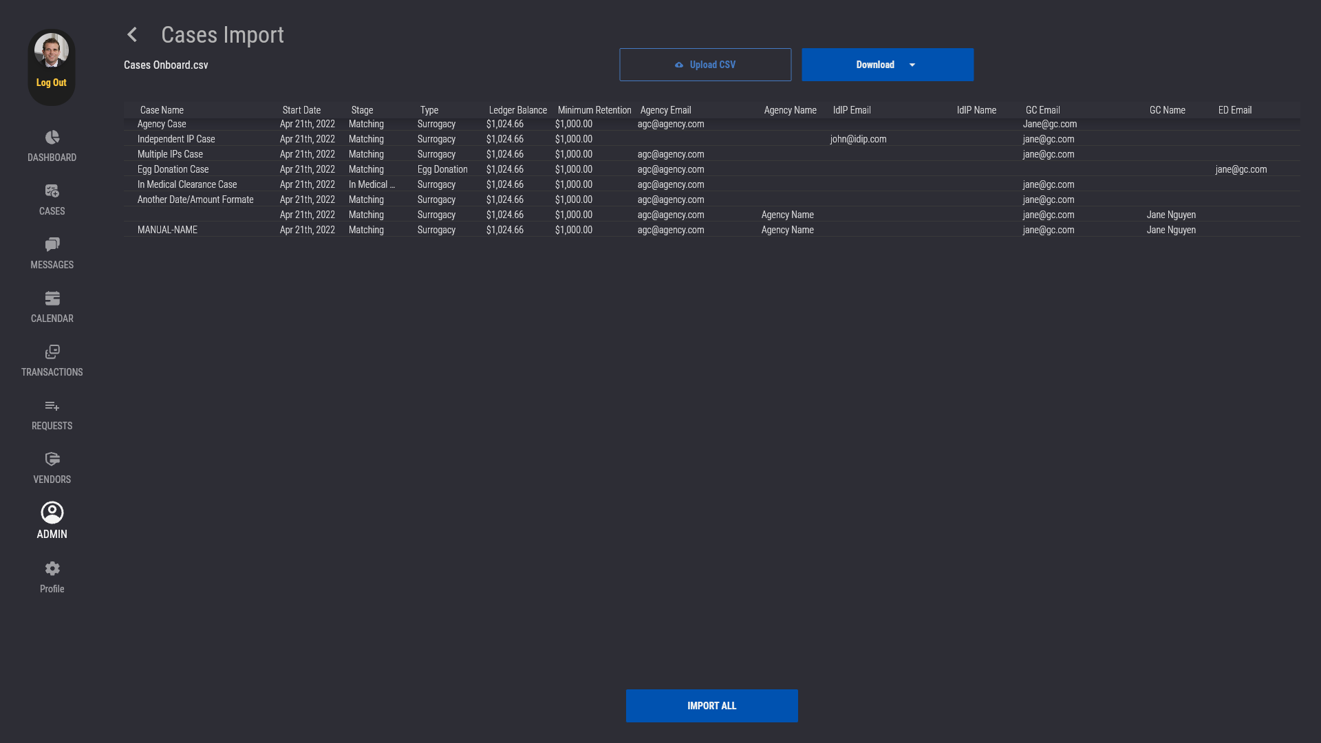 Double-check to make sure that the information of the cases you've uploaded is correct, then press "Import All".
