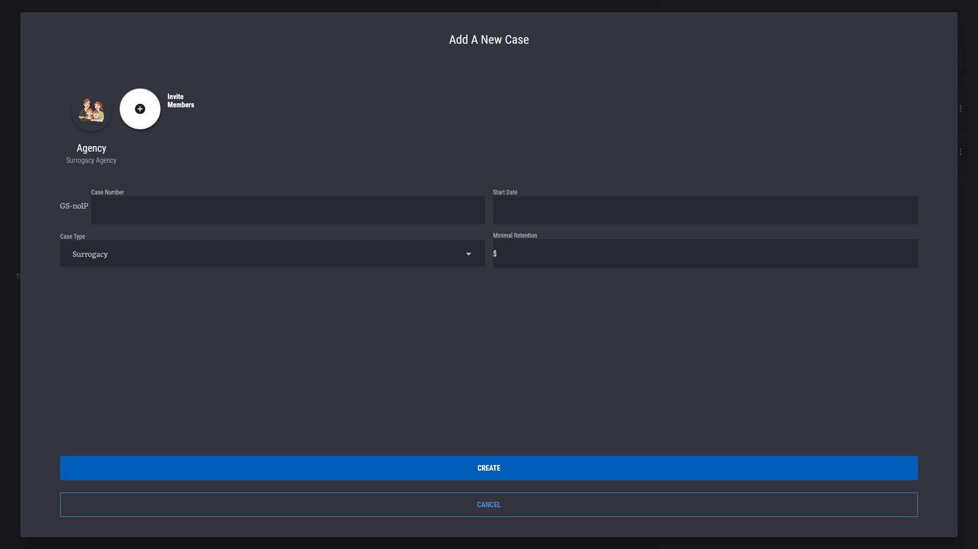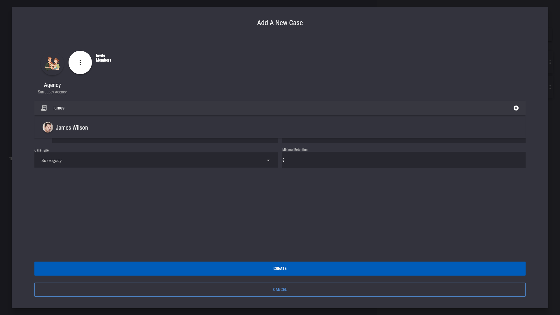 Then, in the "Add A New Case" dialog, add users that will be associated with this case. Press the "+" or "Invite Members"